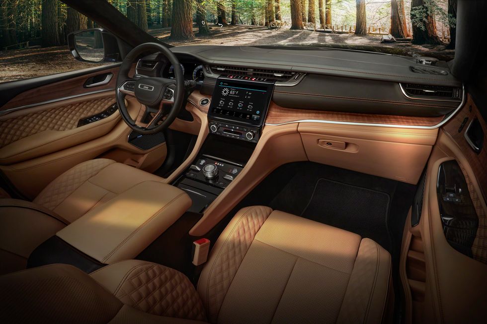 Jeep says that the Grand Cherokee L’s proportions were inspired by the original Wagoneer, and you’ll see a bit of the new Grand Wagoneer concept’s flair blended in as well. The largest dose is in the seven-slot grille, which is slanted slightly forward, with slim LED headlights attached on either side. Below, the new model’s front fascia features active openings and has grown, hiding driver-assistance tech, compared with the previous generation. A gloss-black roof is available on the Overland model and standard on the Summit, and the roofline flows into thin LED taillights. An available Summit Reserve package includes a set of 21-inch wheels while the top two models get standard 20-inch wheels. The Limited and base Laredo models sit on 18-inch wheels.